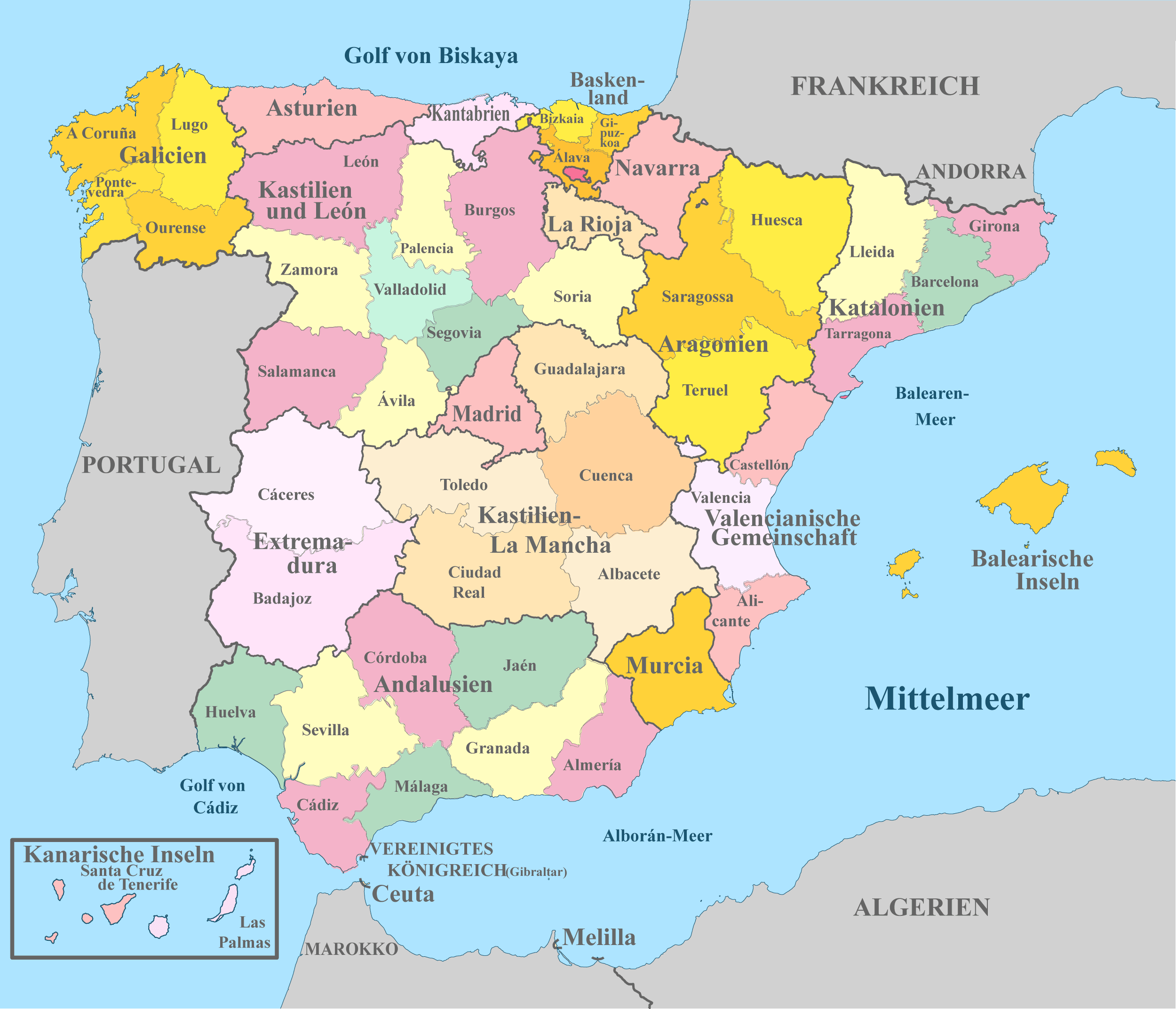Spanien – Karten gegliedert nach Regionen und Provinzen sowie Nachbarländern